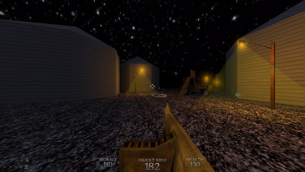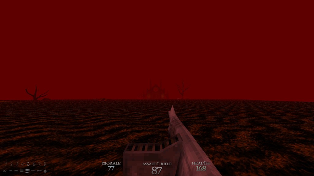 Let’s discuss the atmosphere and level design, which align perfectly with the title of the game. The first episode includes plenty of tight interiors that are spaced out by expanses of brown, sodden ground beneath forebodingly grey and red skyboxes. Szymanski was able to do a lot with a little, as the graphics are polygonal without much room for very intricate detail. The composition of each level is what complements the barebones approach to these environments. Many of the levels’ borders are defined by rows of dead trees that can also be seen in the far, foggy distance. Large, dilapidated farmhouses and barns conceal evil enemies lying in wait. A corn maze splits the rain-soaked second level in half. It’s quick and easy to get through, yet additions like this go a long way in delivering an immersive first impression. As the levels progress, there are more and more memorable moments that build on Dusk’s feelings of isolation, horror and suspense.