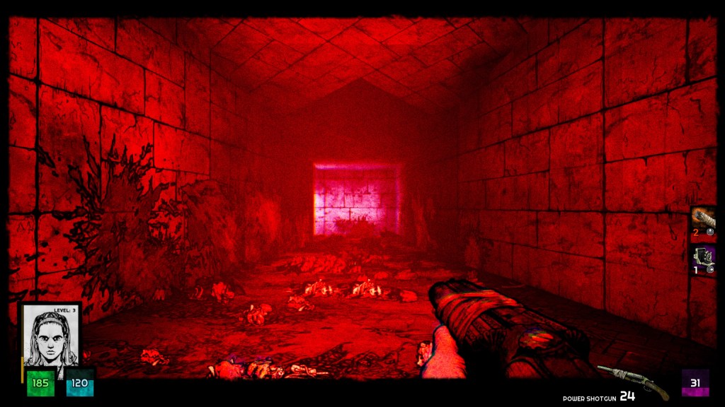 If we’re talking about personality, then allow me to praise the extra details sprinkled into Dusk that I can’t forget. Some of these connect to the gameplay, like the way enemies are blown back forcefully by a centered shot from the hunting rifle before combusting into clouds of blood, and some are there to elevate the B-movie mood of the entire adventure, like the haunting voice of the demonic antagonist saying, “Go on, take it. Taste the power” right before you pick up a time-slowing powerup for the first time in Escher Labs. Then there are comedic boss encounters like the Intoxigator and Big John. There is a trophy that can be attained by killing the Intoxigator while intoxicated off the beer bottles scattered around the arena, and Big John is a parody of Arnold Schwarzenegger whose 80’s and 90’s movies I incidentally love (is Terminator 2: Judgement Day the greatest sequel of all time?) Bars of soap can be found once per level and thrown at any dirty cultist you choose, resulting in an instant kill. There are also inconsequential abilities thrown in like rapidly spinning your weapons around, which can actually kill enemies if you’re close enough, as well as deflecting projectiles back at enemies with the sickles, something I didn’t know was a possibility until I ran out of ammunition during my second playthrough. You won’t use these discreet features a lot, but the fact that Szymanski took the time to develop them adds to the lasting impact of Dusk as a game with its own voice. There are so many small aspects of the game that ironically stand out upon reflection. I can see myself in the future, saying, “Remember Dusk, that game where soap makes people explode?”
