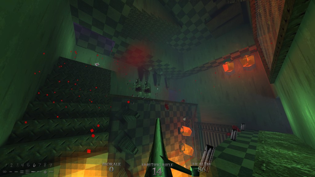 Heading into the Escher Labs in Episode Two feels familiar enough. Maniacal doctors roam around a hospital full of otherworldly experiments as you pass through rooms full of beakers and other scientific paraphernalia. However, the turning point of the level acts a literal turning point, since the whole lab suddenly folds in on itself and becomes a fragmented house of horrors with stairs on the ceiling. SOMETHING ISN’T RIGHT, according to the red text on the screen, to which you’ll respond, “No shit.” It’s another example of Dusk making a statement in its own language. The game feels like an amusement park instead of one wild ride. One moment you’re on a steep rollercoaster, blasting Mages to bits with the Super Shotgun, and the next you’re tiptoeing through a haunted house, still blasting Mages to bits with the Super Shotgun albeit more methodically.
