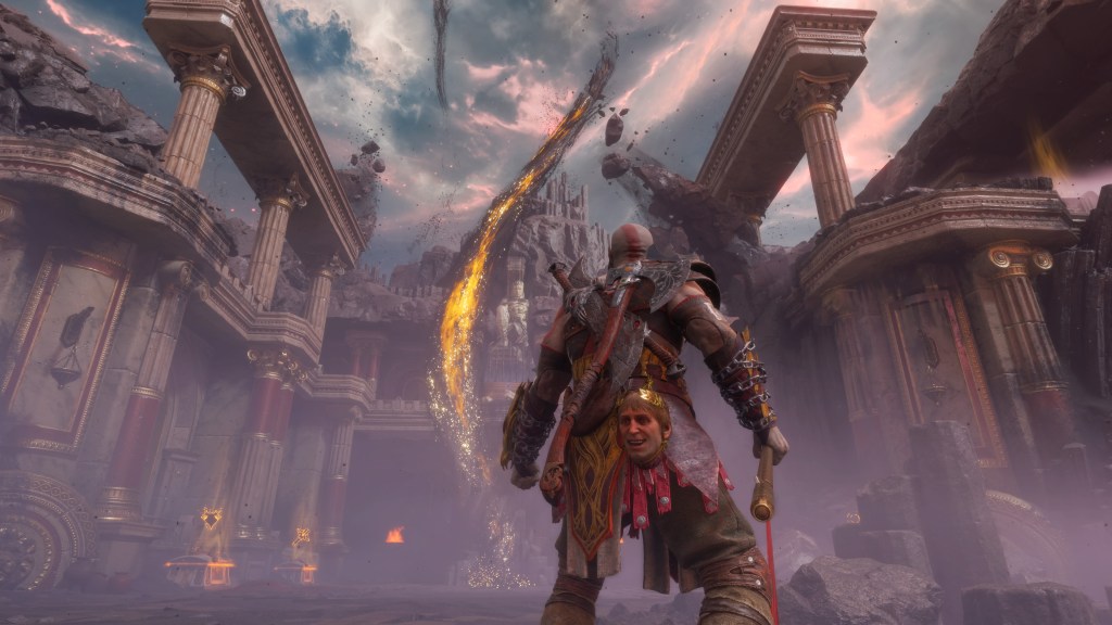 Also returning is Hermes. Well, not all of him. Just the head. After speeding down a zipline to reach the hub area of Olympus, I noticed that Mimir looked a bit different. . . Then he began speaking sardonically, mocking Kratos for how soft he’s become and for his foolish endeavor to evolve from the monster he has always been. Hermes’ heckling brought a huge smile to my face, as he began voicing exactly what I had been thinking during my Ragnarök playthrough! The return to Greece was the curveball that Valhalla needed to keep me interested, even if the purpose was not to celebrate the younger Kratos but instead lay him to rest. Now is a good time to tell you that young Kratos does also make an appearance at the end, albeit a wordless one while current Kratos delivers a cringe-inducing monologue of raw emotion that young Kratos won’t deign to answer (at least that’s my canonical reason for his cold silence). I snickered a little at the juxtaposition between the Shakespearian Kratos getting choked up by his own speech and the throne-occupying Kratos who looks ready to smash his face in at any moment.