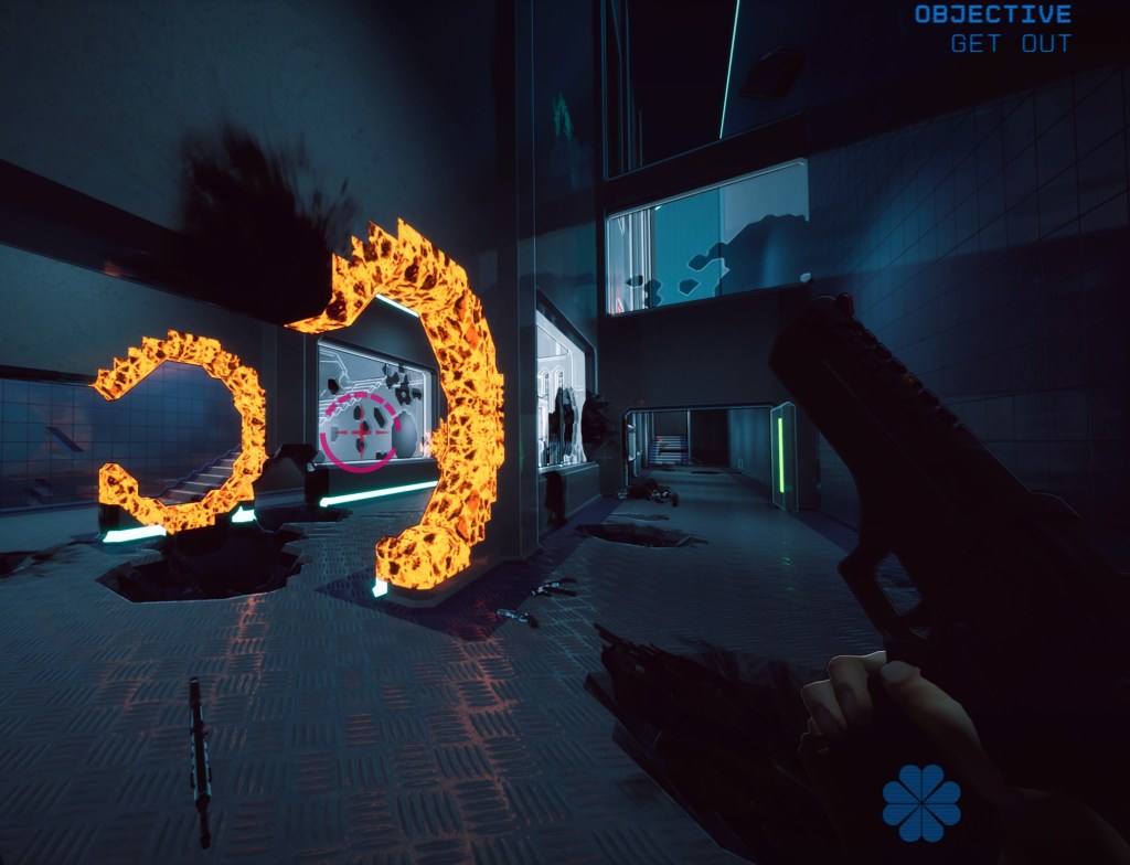 As I stated before, the atmosphere of Severed Steel is at first cold and somewhat lifeless, much like our injured and forgotten protagonist, until the steam of hot gun barrels heats things up. I began to realize that Greylock Games Studio was consciously foregoing frills and traditional sequential progression for the sake of retaining focus on extremely captivating gameplay that shares the intensity of Doom Eternal with none of the in between platforming or exploration. Everything is delivered to players up front, typically in one large building or chamber divided by doors and architectural designs that encapsulate the map-editor nature of each level where realism is unnecessary and therefore disregarded. Erratic walls and ledges bridge the gaps between Steel’s next acrobatic feat, whether it be diving headfirst through a window and evaporating foes with a laser gun before the glass can hit the ground or bouncing between nondescript blocks to reach a better vantage point (from which pesky jetpacking enemies can be sniped more accurately). As the game goes on, the developers put more and more trust in player agility. This is reflected in the escalation of level complexity. The simulation-style starkness of the game remains a visual constant, yet basic designs are superseded by unexpectedly ambitious ideas requiring player imagination to fill the graphical gaps in their presentation. I had so much fun jumping between two moving trains as I cleared one car after another, or dispatching several elite assassination targets in what looked like a loose rendition of a city block, where leaping from rooftop to rooftop provided plenty of rewarding liberty. When tasked with destroying a multi-storied building (a unique objective that’s only seen once), I gleefully hunted down several flamethrower enemies so I could steal their bulky armaments and burn everything in sight, thus drastically increasing my rate of ruinous productivity. I was repeatedly caught off guard by the intricacy of new level designs, the interesting context clues they provided for the purpose of retaining a sense of story progression, as well as the varied objectives they contained. Severed Steel is deliberately modest in the way it’s presented, yet underneath the surface lies hours and hours of awesome action-movie choreography directed and performed by none other than the players themselves.