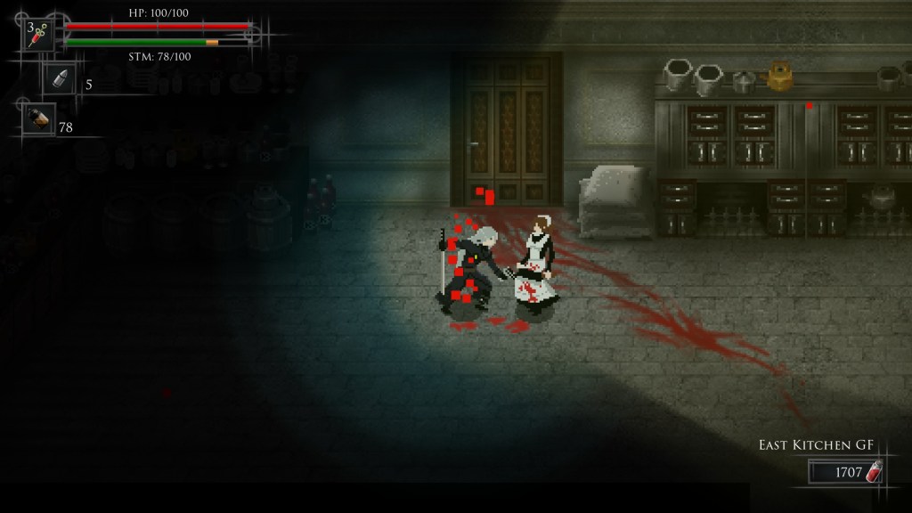 Careful swinging that cane around because Veimar does indeed have a stamina meter. If you weren’t already reminded of Bloodborne by Veimar’s black overcoat, gun, and trick-cane, then the stamina meter, vials of health-replenishing blood, as well as a somewhat overpowered parry will inevitably reveal traces of developer Pugware’s inspiration. Although there is a dodge-roll that can come in handy when avoiding certain AOE attacks, parrying became my bread and butter during combat. After entering a defensive stance by holding L1, players can then tap R1 to deflect incoming scythes, knives, and sickles. This will literally bring attacking enemies to their knees, inviting Veimar to run them through with his Iaito Cane for big damage. Upon carrying out a successful parry, players will hear a breathy whisper, signifying their opportunity to step in and stab. If an enemy survives being impaled, they will immediately begin attacking once more, allowing for a constant chain of parries and critical hits at a much faster rate than anything seen is a soulsborne game.