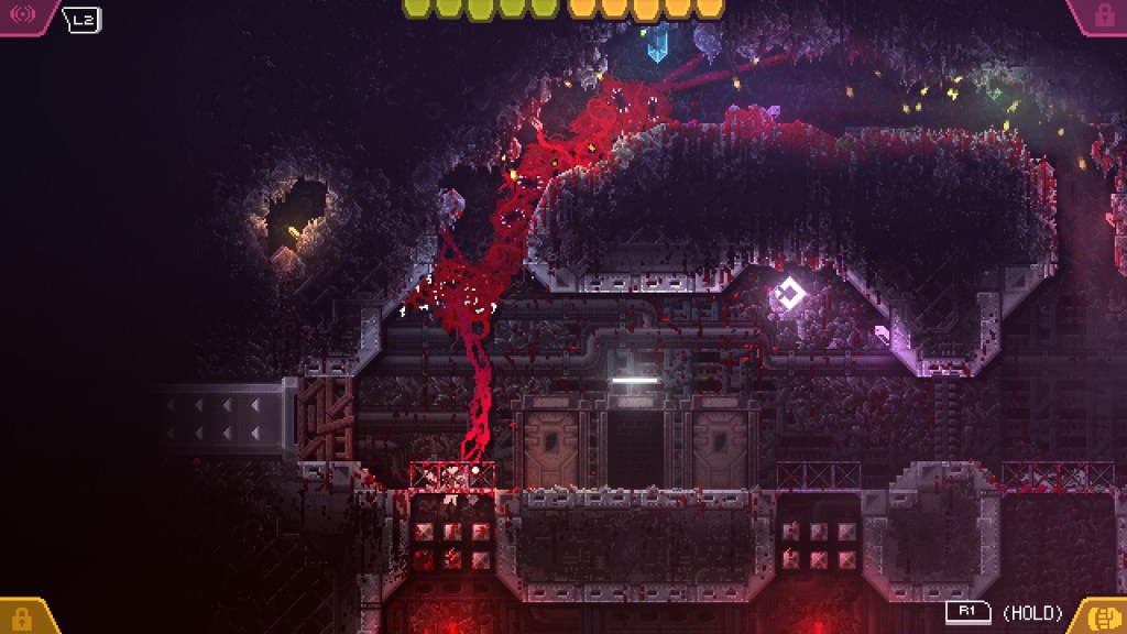 Carrion is more than just a savagery simulator. The creature must pull off quite the operation to exit captivity. A hub world includes entrances to several different sections of the lab, where new upgrades and abilities can be unlocked. In metroidvania fashion, these areas can be later revisited to access previously cordoned rooms containing improvements to the mushy mutant’s abilities. As you navigate through each area of the vast, semi-subterranean lab, you’ll encounter laughably poor defenses in the form of peashooter pistols wielded by minimally trained researchers who don’t know whether to fire or run into the bathroom stall (that won’t save them). However, your victims’ defense tactics grow sharper as guards equipped with assault rifles and supercharged shields threaten to melt your health, as well as mechs mounted with blistering cannons.